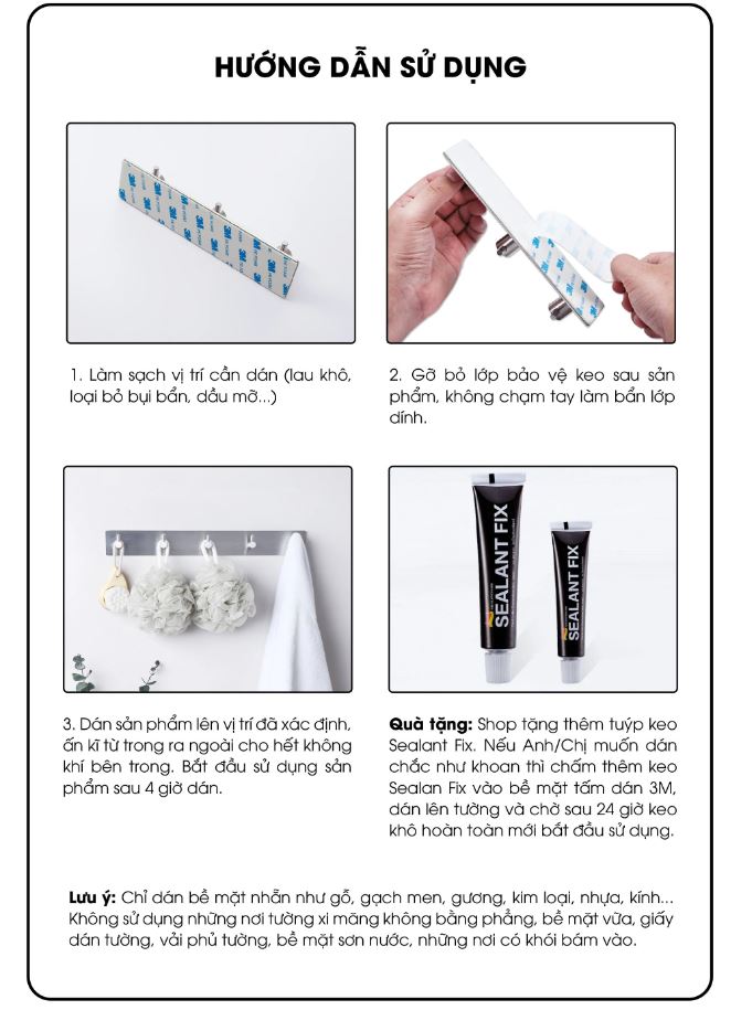 - Bạn có thể dán và sử dụng công nghệ keo 3M trên bề mặt nhẵn như gỗ, gạch men, gương, kim loại, nhựa, kính, vách....