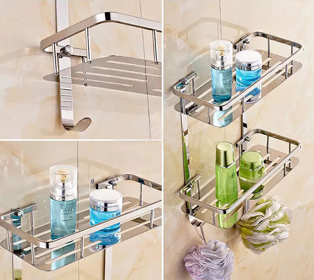 Giá để đồ có khả năng thoát nước nhanh giúp các vật dụng bên trên luôn khô ráo, sạch sẽ. Bạn có thể để tất cả các loại dầu gội, sữa tắm, mỹ phẩm… mà không lo thiếu chỗ.