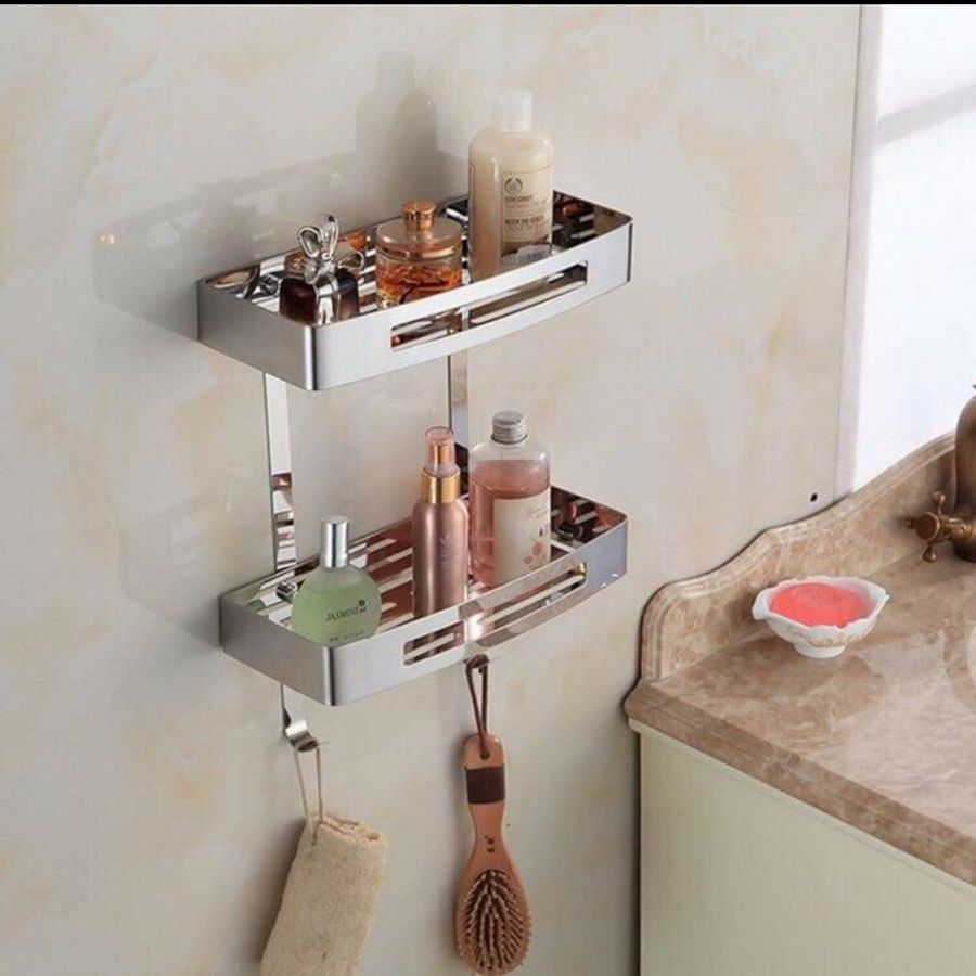 Giá kệ 2 tầng có hình tam giác, 2 mặt áp sát vào tường nên cực kỳ chắc chắn & gọn gàng, bạn có thể đựng rất nhiều các vật dụng như dầu gội sữa tắm… trong nhà vệ sinh, các loại gia vị, nước mắm, dầu ăn trong nhà bếp hay 1 vài chiếc cốc, hay cả đồ mỹ phẩm của chị em.