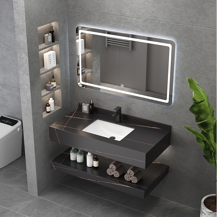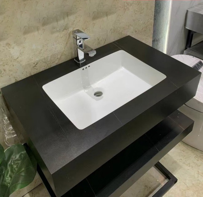 Kệ Lavabo 2 Tầng Đen Vân Vàng Chống Trầy Kèm Lavabo Âm 80x50