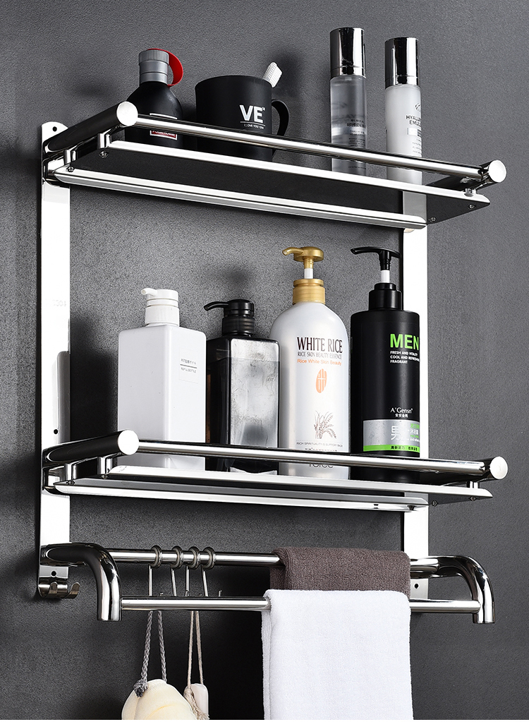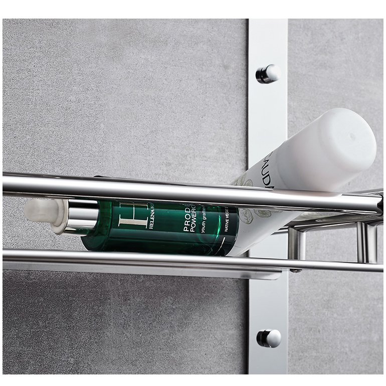 Giá để đồ kết hợp treo khăn inox có thiết kế hiện đại & đa chức năng với kệ để đồ, thanh vắt khăn và móc treo tiện lợi giúp bạn sắp xếp các vật dụng trong phòng tắm một cách gọn gàng, ngăn nắp mà không chiếm nhiều diện tích.