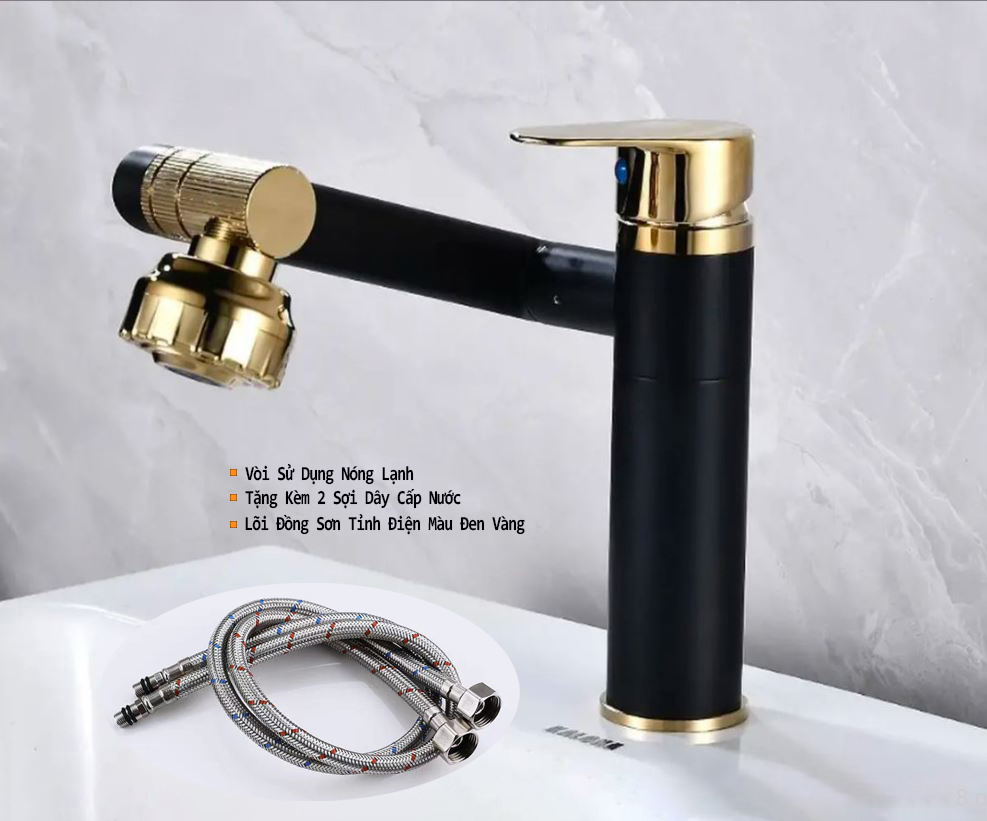 Chất liệu: Đồng nguyên chất mạ lớp sơn tĩnh điện đen chống trầy Màu sắc: Đen huyền+ Vàng bóng Cấu tạo: Nắp+ Thân+ đế+ 2 dây cấp nước nóng lạnh Chức năng: Sử dụng trong phòng tắm hiện đại nóng lạnh